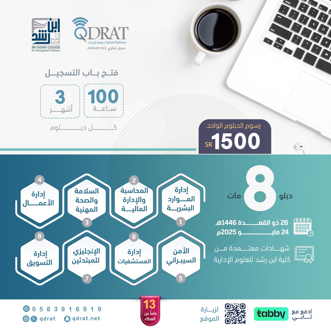 The Community Service Center at Ibn Rushd College for Administrative Sciences, in collaboration with the Qudrat platform, announces the opening of registration for 8 accredited professional development diplomas, offered remotely for a duration of 3 months, totaling 100 training hours. Diplomas offered: Human Resources Management Accounting and Financial Management Occupational Safety and Health Business Administration Cybersecurity Hospital Management English for Beginners Marketing Management For registration and inquiries, please contact the number provided at the bottom of the announcement.